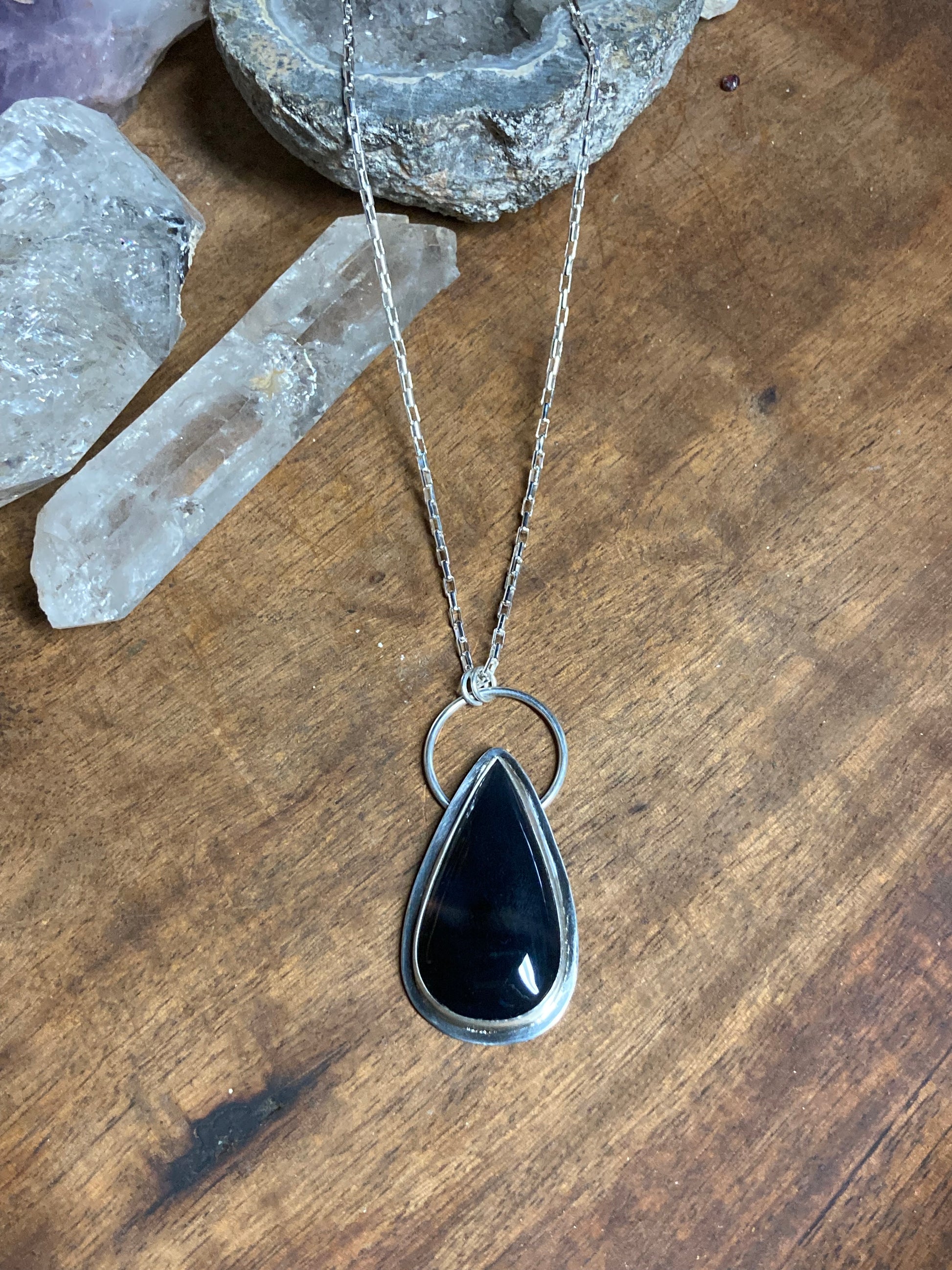 This one-of-a-kind necklace features a sleek teardrop of deep black onyx, bezel-set in sterling silver and suspended from a graceful silver circle. The stone’s glossy, inky surface feels like still black water — timeless, protective, and grounding.
