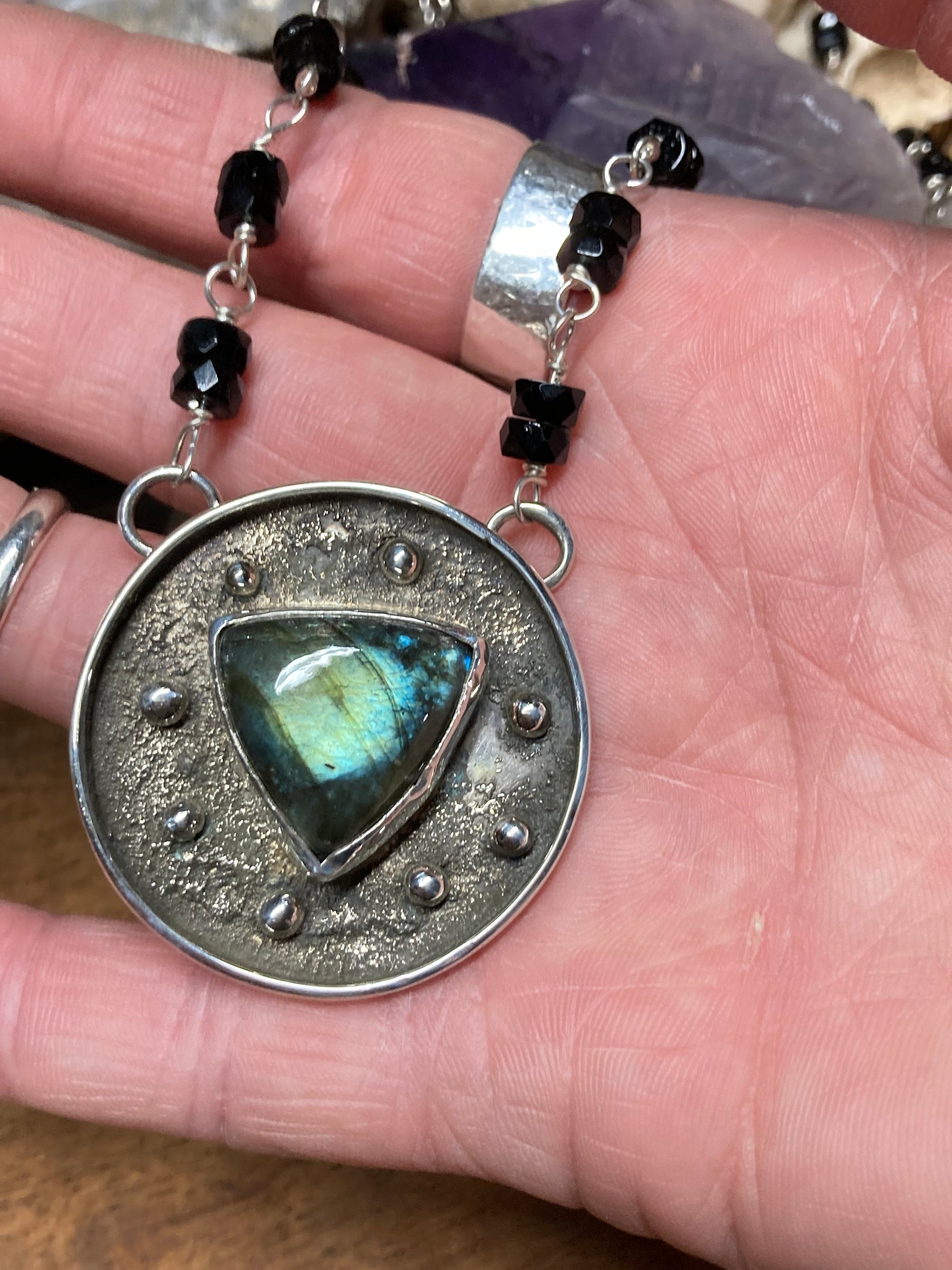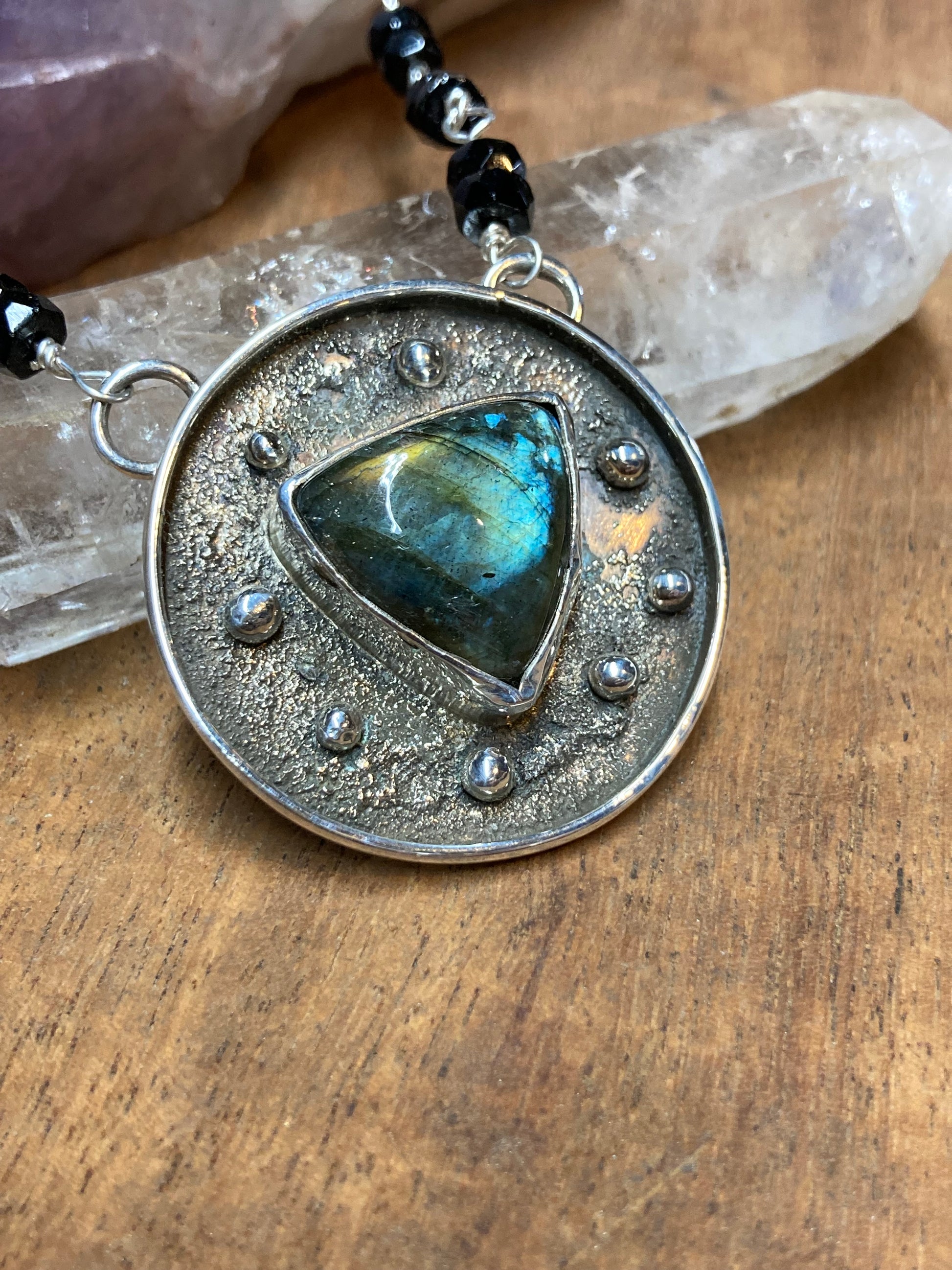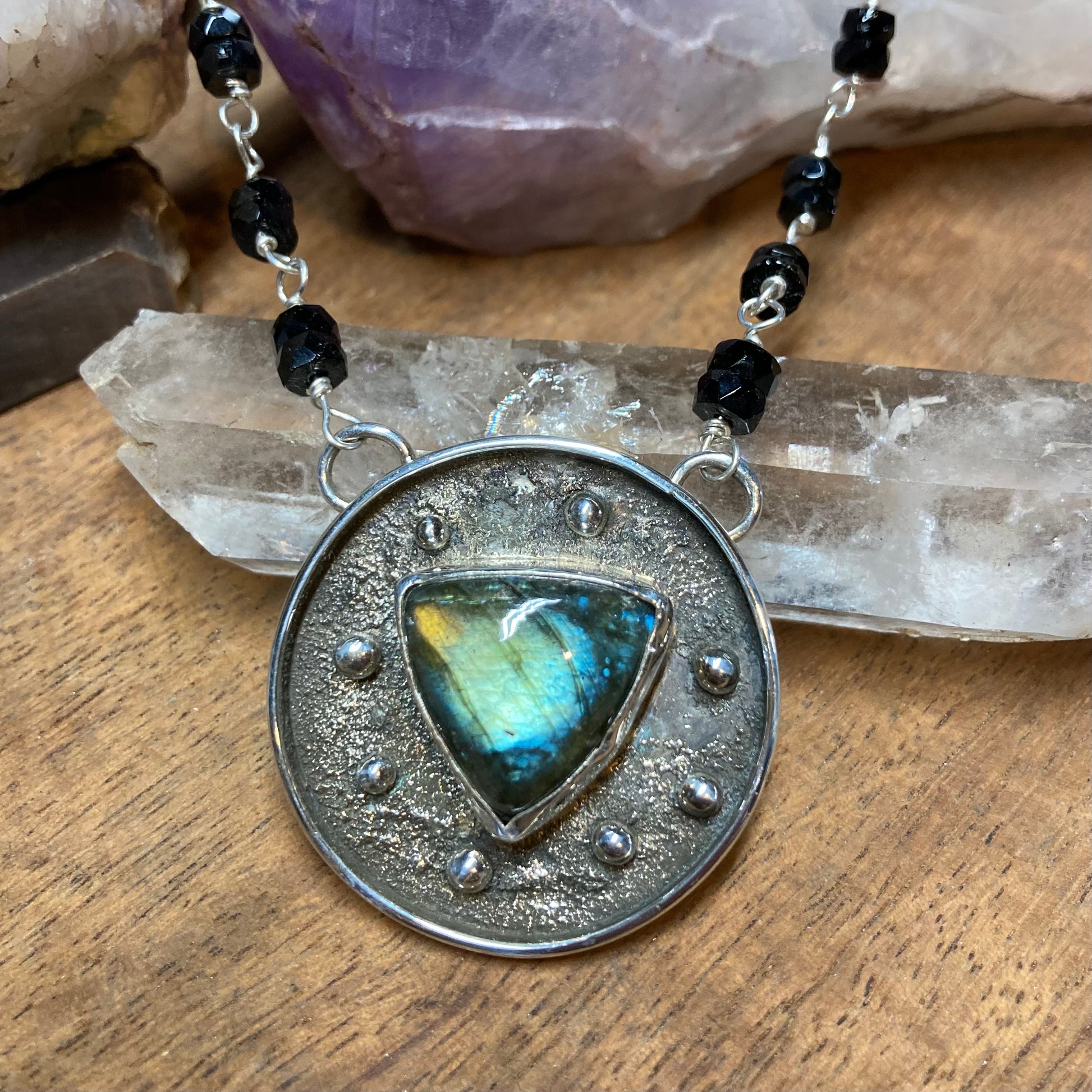 Power and mystery meet in this one-of-a-kind handcrafted adornment. A mesmerizing, triangular labradorite gemstone takes center stage in this sterling silver pendant, surrounded by a textured disc design accented with silver granules. The handmade chain features vintage black glass beads, adding both sparkle and depth.